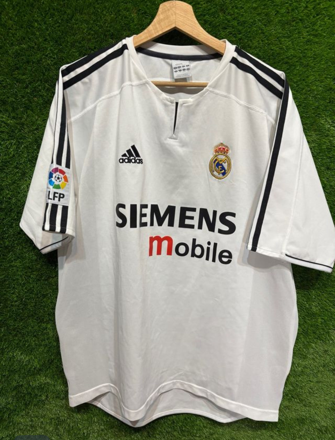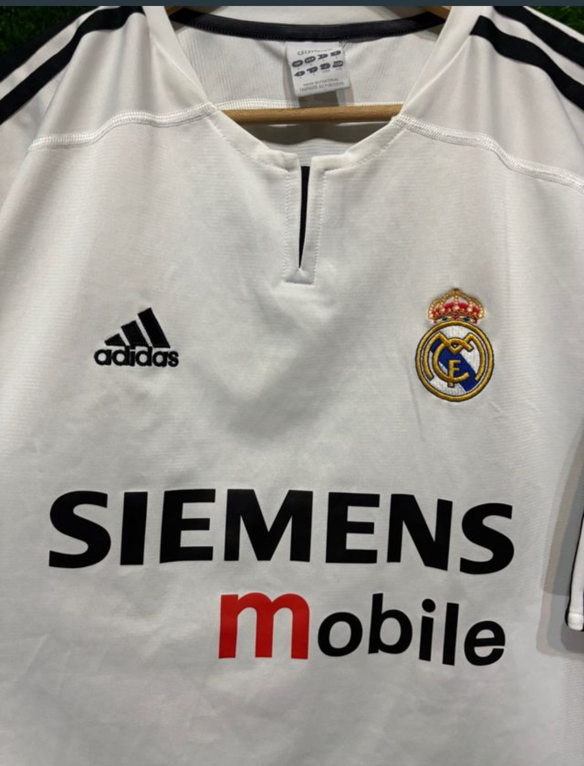 La camiseta del Real Madrid 2003-04 es un auténtico clásico de la era galáctica, usada por leyendas como Zidane, Ronaldo, Beckham, Figo y Raúl. Fabricada por el fabricante alemán, presenta un diseño sobrio y elegante en blanco puro, con el logo de Siemens Mobile como patrocinador principal en el pecho. El escudo del club bordado y las icónicas tres bandas en los hombros completan un look minimalista que refleja la grandeza y el estilo del club. Una pieza esencial para coleccionistas y aficionados que recuerdan una de las etapas más icónicas en la historia del Real Madrid.