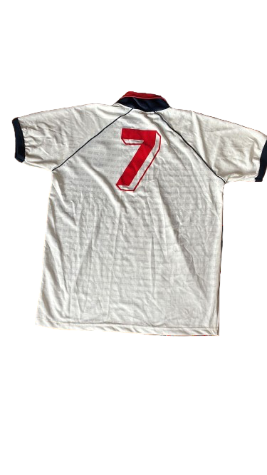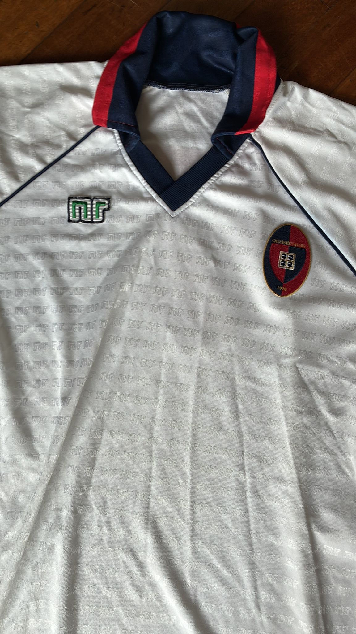 Esta camiseta visitante presenta un diseño limpio en blanco con vivos en azul marino y rojo, rematada por el característico cuello bicolor tan representativo de Ennerre a finales de los 80. En el pecho destacan el escudo serigrafiado del Cagliari y el logo NR, mientras que en la espalda luce un elegante dorsal 7 en terciopelo rojo, uno de los acabados más icónicos del calcio vintage.