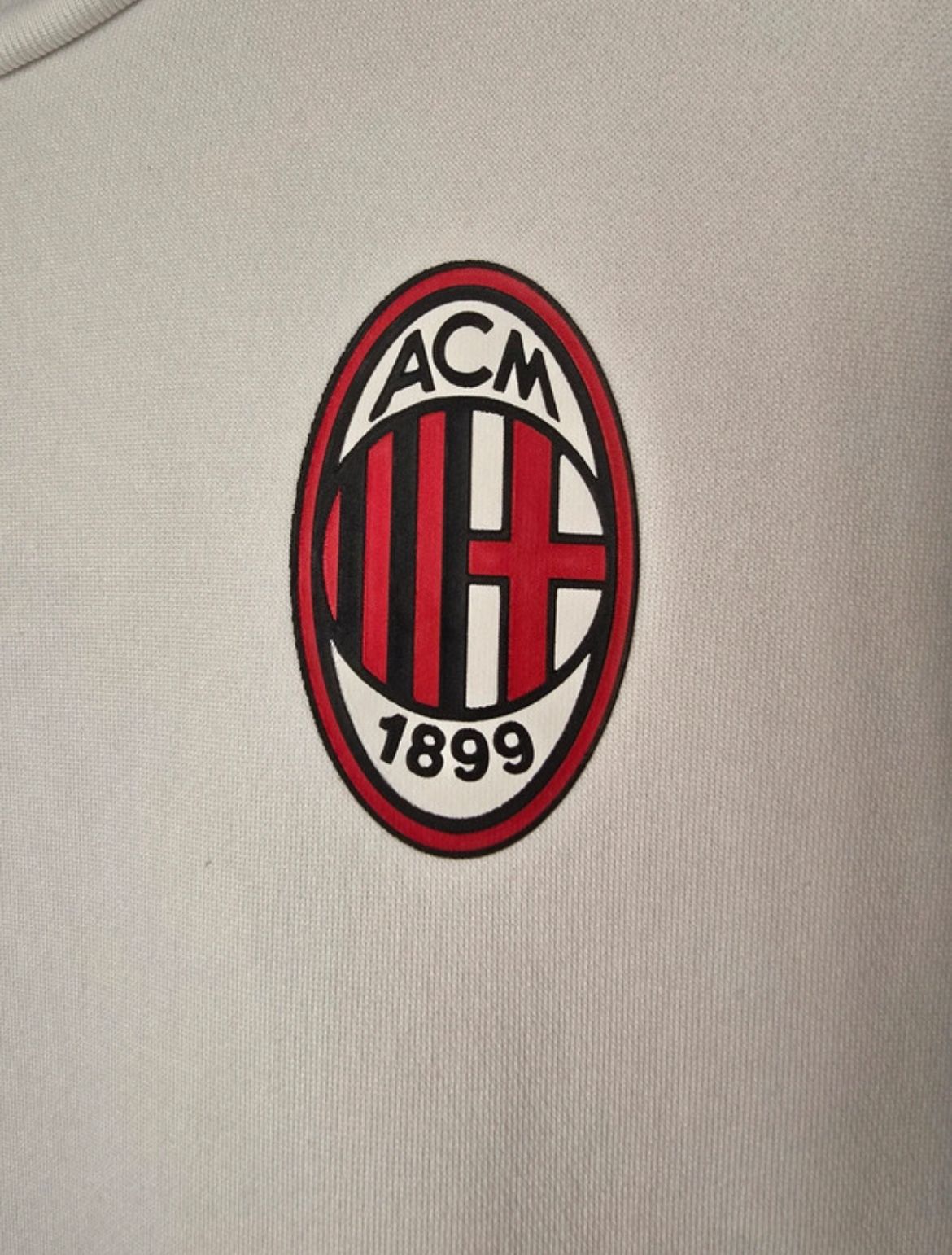 Diseño blanco con las emblemáticas franjas rossoneras en las mangas y escudo serigrafiado en el pecho.