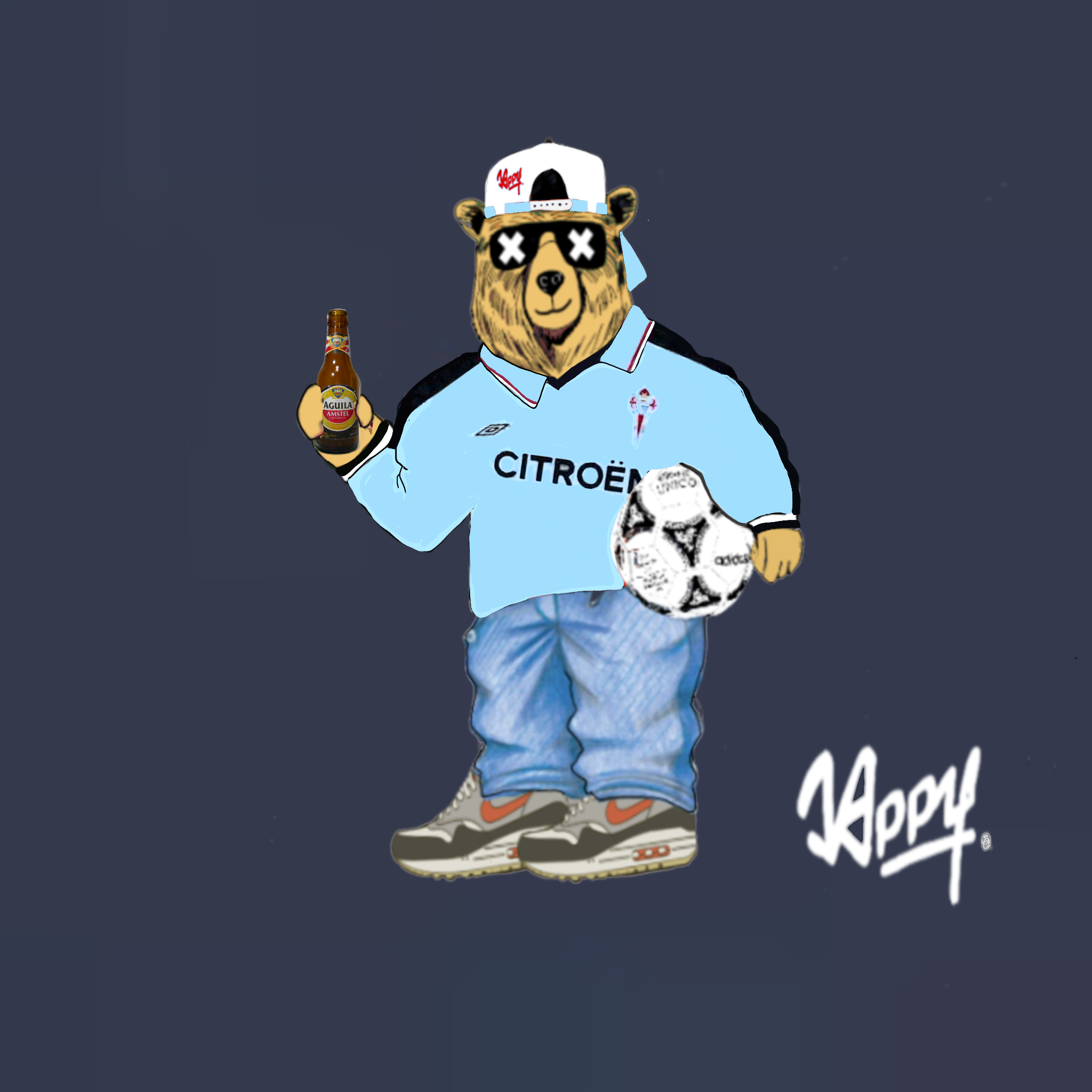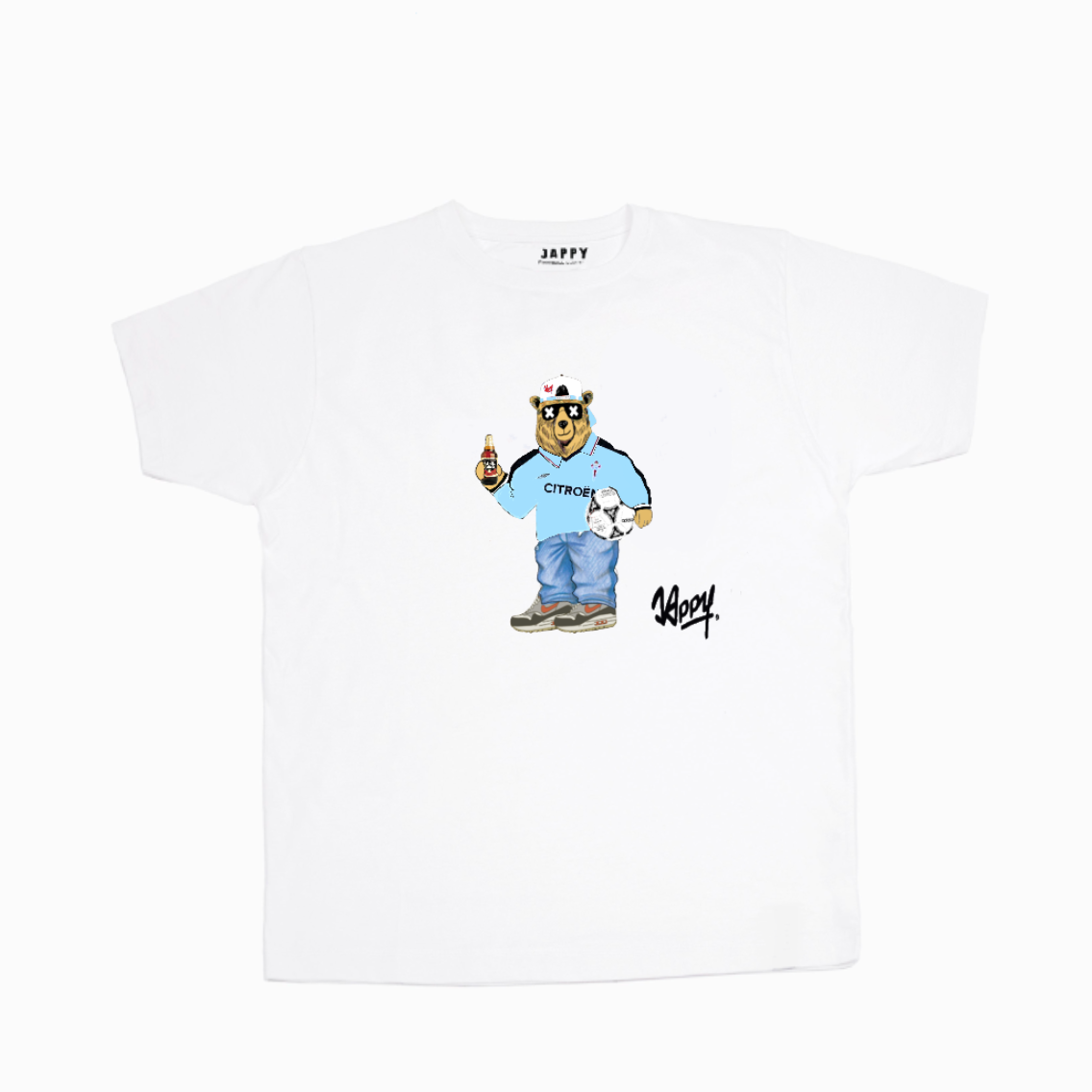 Esta camiseta Oso Euro Celta es un homenaje directo a aquella era irrepetible. Nuestro icónico oso Jappy viste el mítico celeste, balón Etrusco bajo el brazo —símbolo universal del fútbol noventero— y una cerveza en la mano, como se vivía el fútbol entonces: grada, calle y sentimiento celeste.