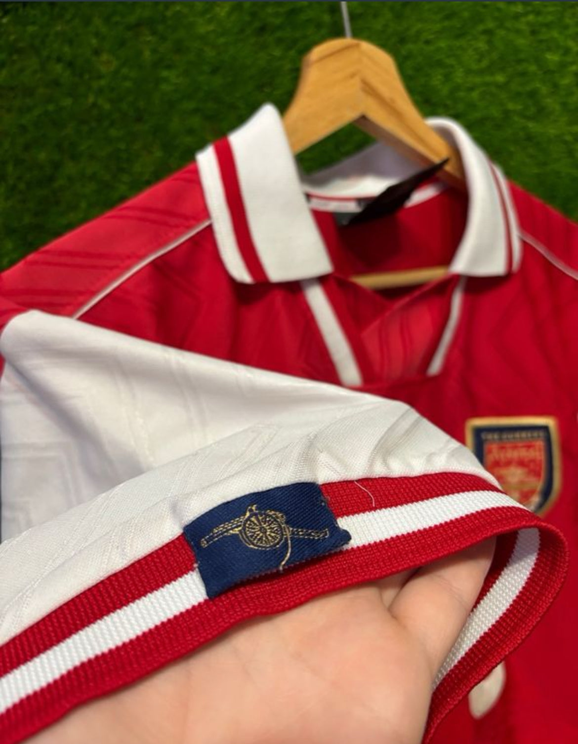Diseño clásico en rojo con mangas blancas, cuello tipo polo con ribetes en rojo y blanco y patrón geométrico en zigzag integrado en el tejido, sello inconfundible de la estética noventera. En el pecho luce el escudo tradicional de The Gunners y el patrocinador JVC, uno de los sponsors más míticos del fútbol europeo.