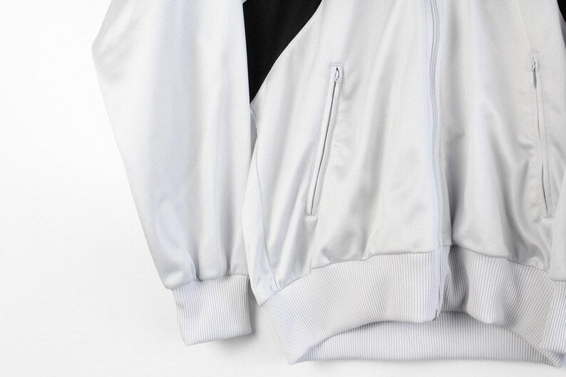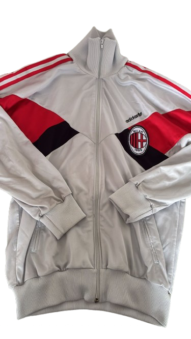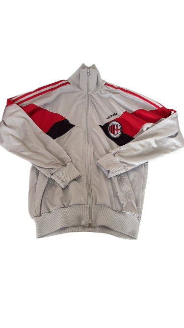 Chaqueta vintage de entrenamiento del AC Milán de las temporadas 1990-93 en talla M y muy buen estado de conservación con signos normales mínimos de uso de una prenda vintage, con el mítico escudo del equipo rossonero y el logo del fabricante alemán.